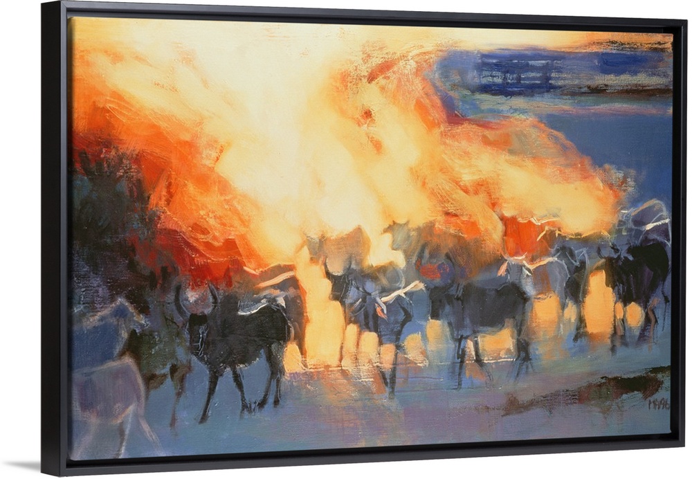 <p>Contemporary painting of a herd of cattle kicking up dust.</p>