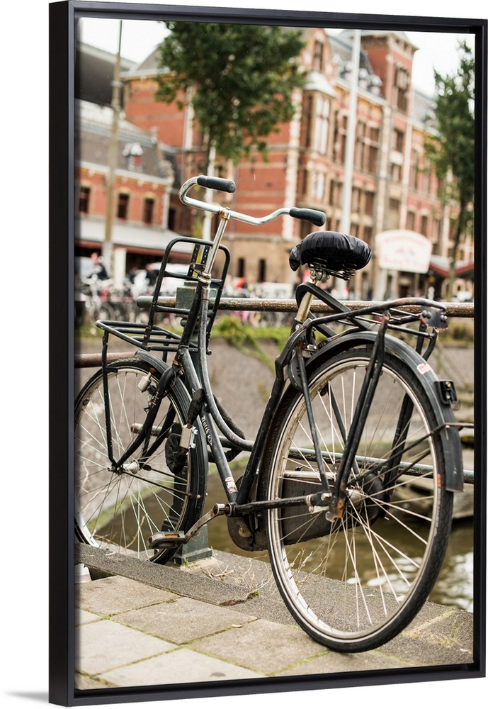 <p>A bicycle leaning against a railing in the Netherlands.</p>