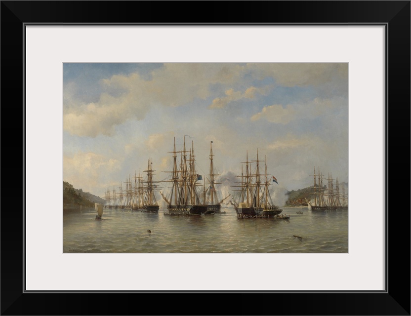 <p>Dutch, English, French and American Squadrons in Japanese Waters during the Expedition, Sept. 1864, by Jacob van Heemskerck, 1864, Dutch painting, oil on canvas. Fleet of European sailing ships and steam ships in the waters off the coast of Japan.</p>