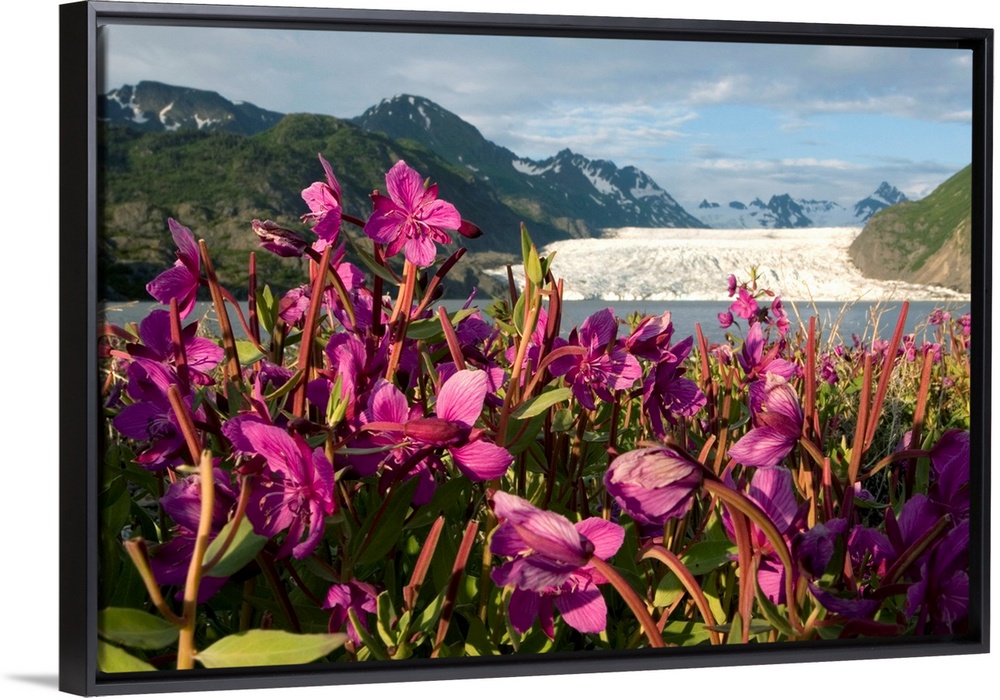 <p>Dwarf fireweed growing on the shoreline of Grewingk Glacier Lake with glacier in background, Kenai Peninsula</p>
