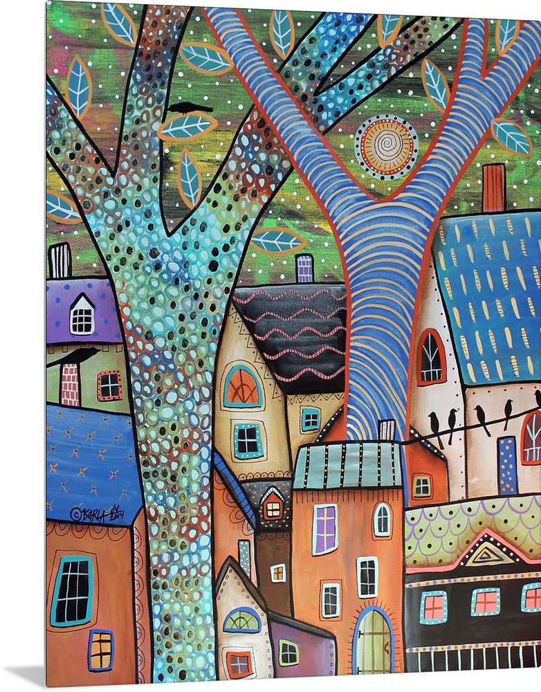 <p>Contemporary painting of a village made of different colored houses with large colorful trees.</p>