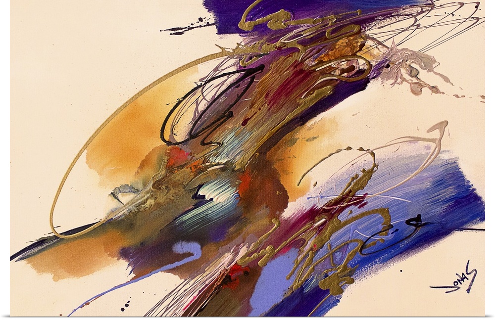 <p>A contemporary abstract painting using earthy tones with splashes of purple and gold in zig zag strokes against a neutral background.</p>