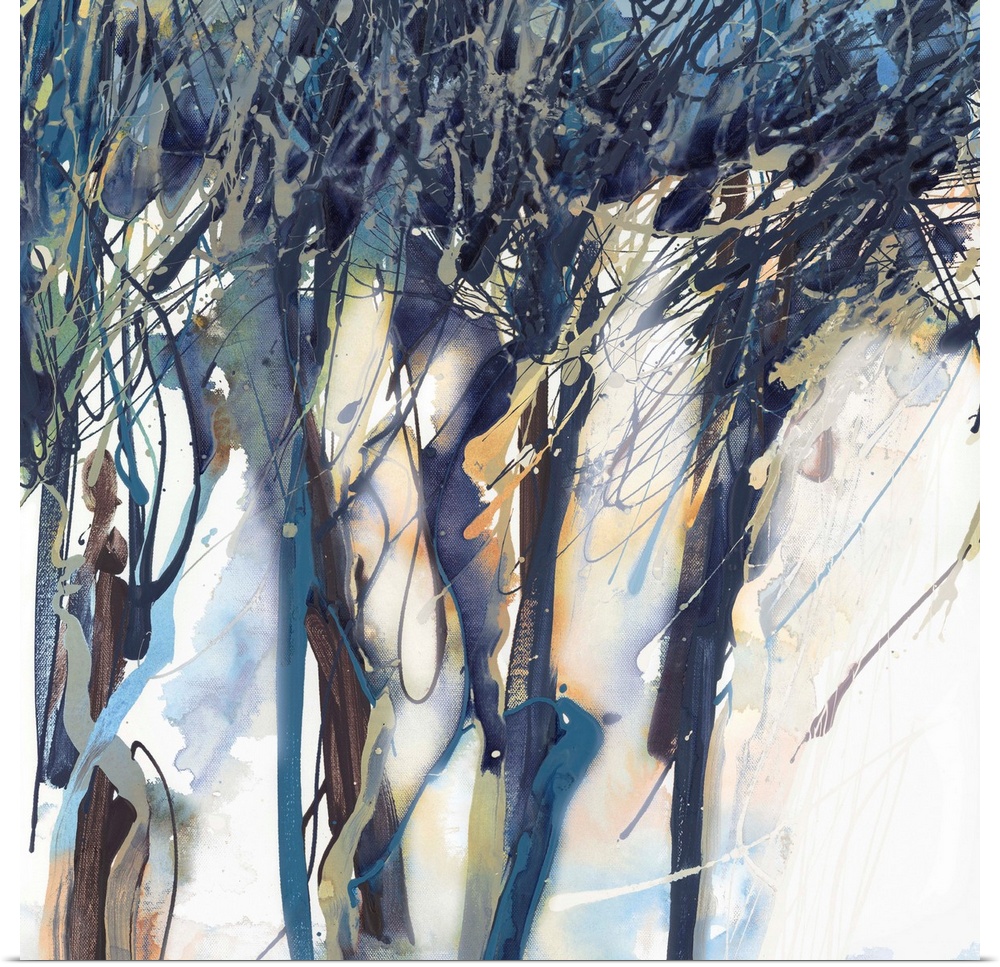 <p>Contemporary abstract painting resembling wind-blown navy blue trees on white.</p>