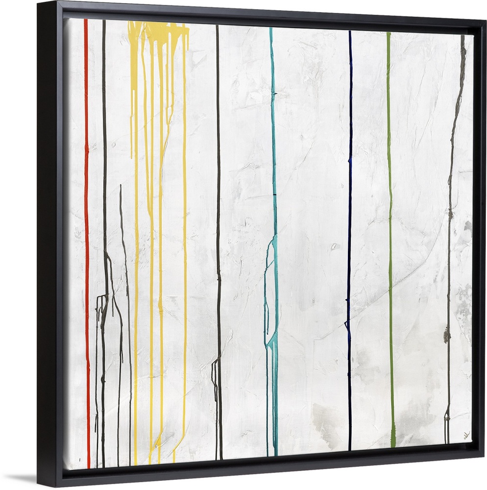 <p>Square abstract art with dripping lines of color in green, orange, yellow, dark blue, light blue, and gray on a white background with some gray to create depth.</p>