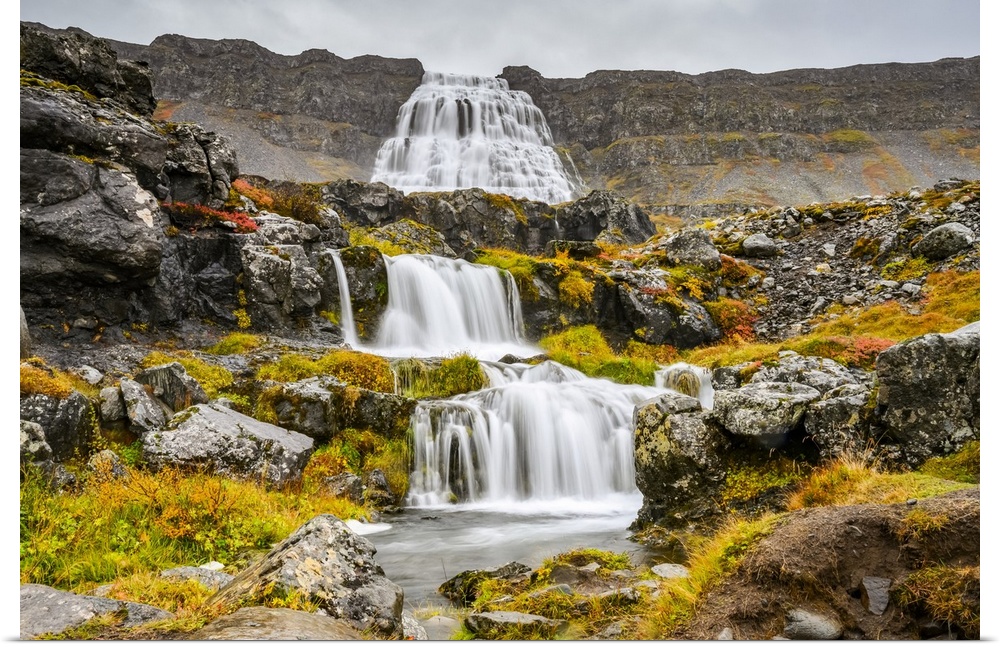 <p>Dynjandi (also known as Fjallfoss) is a series of waterfalls located in the Westfjords, Iceland. The waterfalls have a total height of 100 metres; Isafjaroarbaer, Westfjords, Iceland.</p>