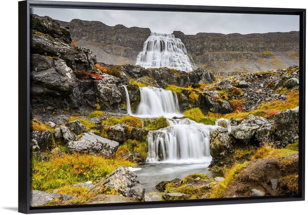 <p>Dynjandi (also known as Fjallfoss) is a series of waterfalls located in the Westfjords, Iceland. The waterfalls have a total height of 100 metres; Isafjaroarbaer, Westfjords, Iceland.</p>