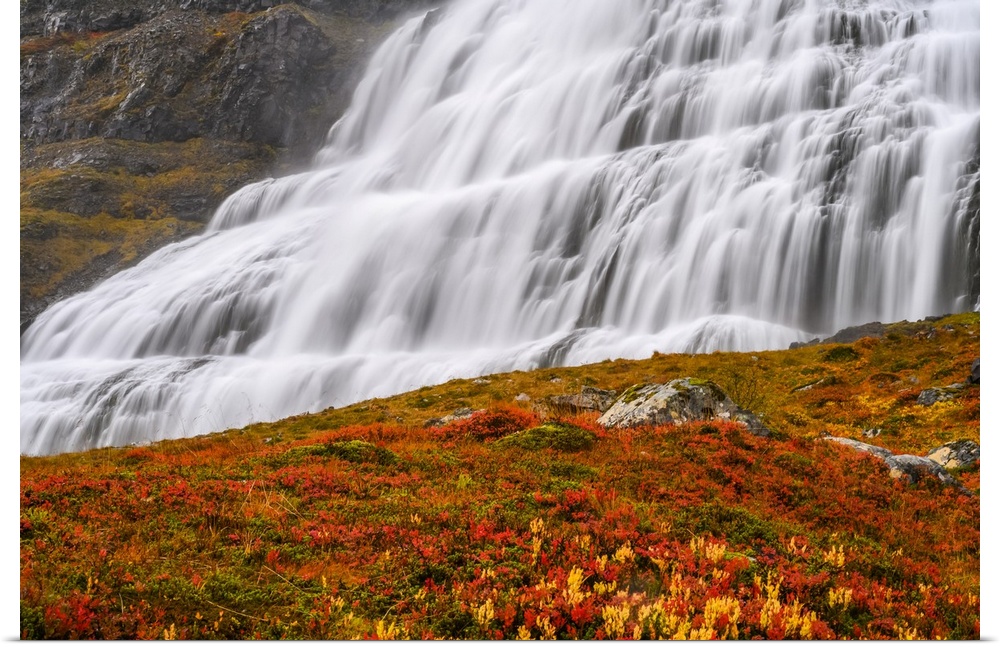 <p>Dynjandi (also known as Fjallfoss) is a series of waterfalls located in the Westfjords, Iceland. The waterfalls have a total height of 100 metres; Isafjardarbaer, Westfjords, Iceland.</p>