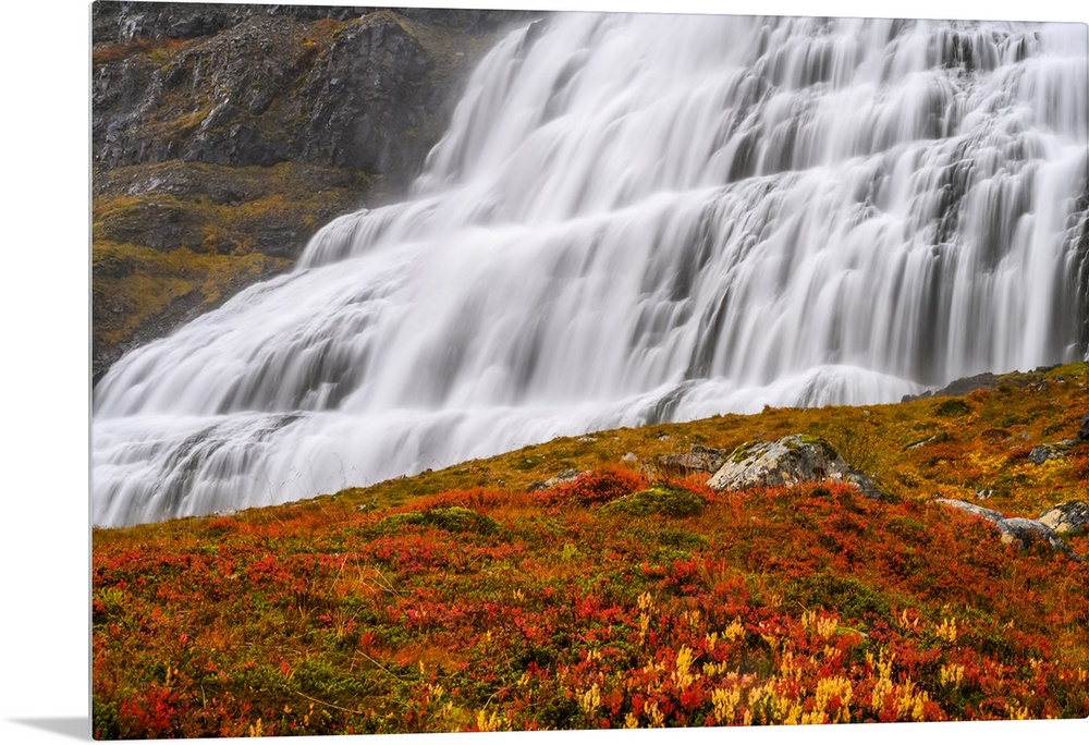 <p>Dynjandi (also known as Fjallfoss) is a series of waterfalls located in the Westfjords, Iceland. The waterfalls have a total height of 100 metres; Isafjardarbaer, Westfjords, Iceland.</p>
