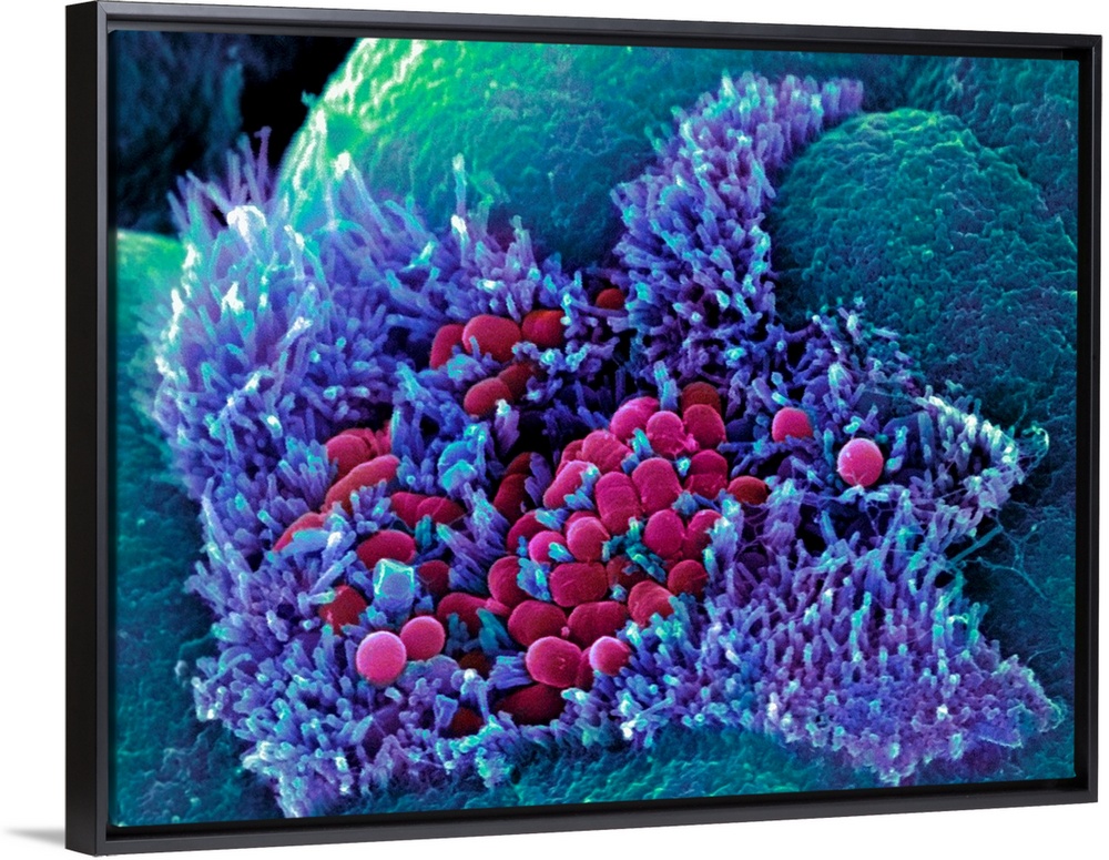 <p>E. coli bacteria. Coloured scanning electron micrograph (SEM) of Escherichia coli bacteria (red) taken from the small intestine of a child. E. coli are Gram-negative rod-shaped bacteria that are part of the normal flora of the human gut. However some strains, including this one, produce a toxin that causes severe diarrhoea and can be fatal, especially in the very young or elderly. Magnification: x5,700 when printed at 10 centimetres wide.</p>