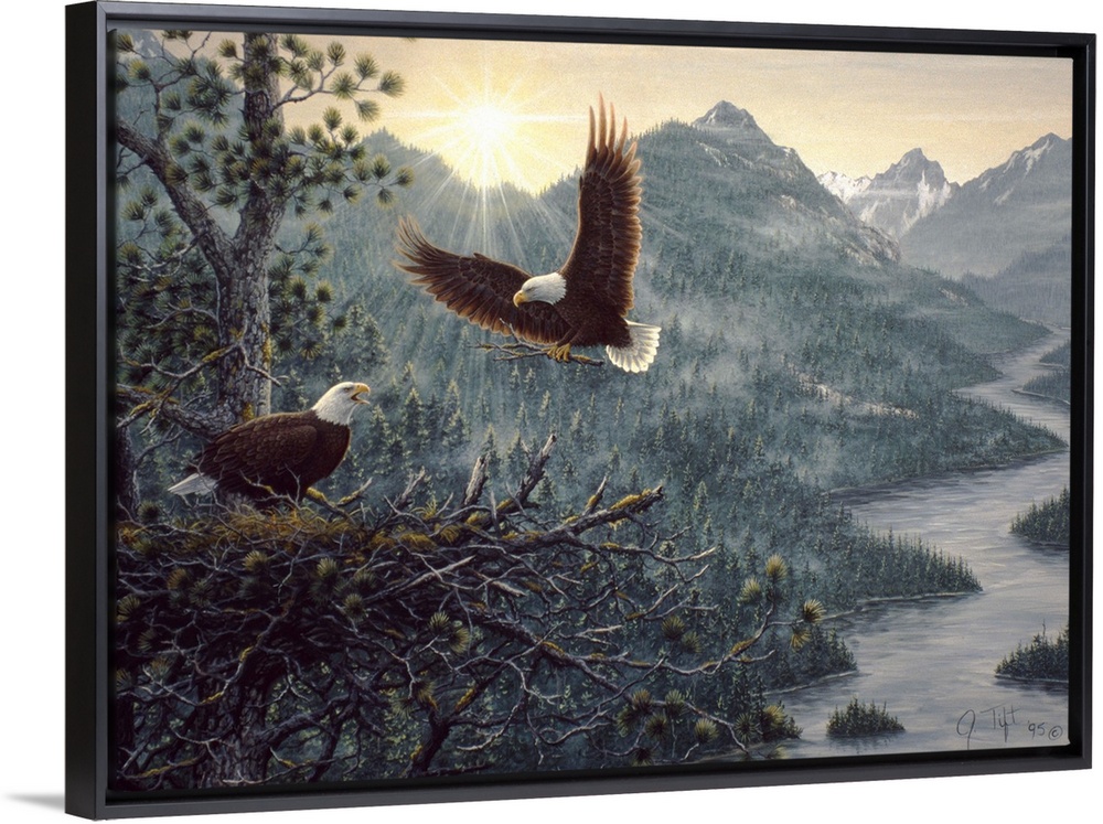 <p>eagles, one in the tree, one coming in for a landing, over looking a mtn brook</p>