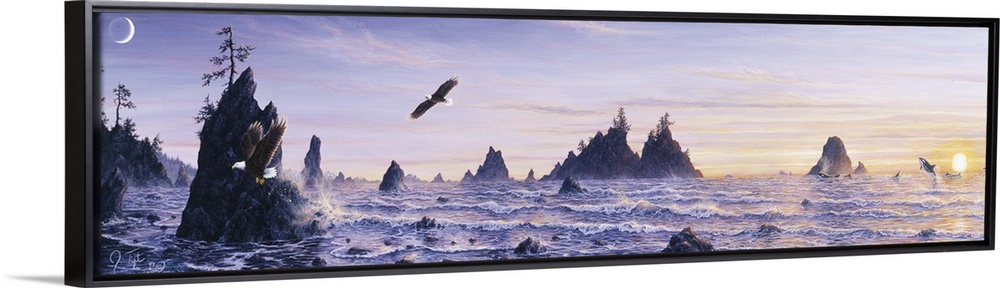 <p>eagles flying over the ocean, whales jumping in the background, with a full moon</p>