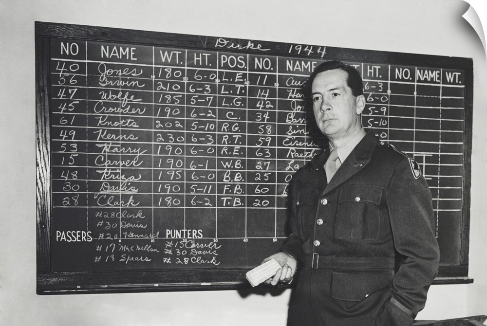 <p>Earl (Red) Blaik was football coach at the United States Military Academy from 1941 to 1958. The blackboard data lists the names, weights, heights, and playing positions of the opponent (Duke University) players. Oct. 27, 1944.</p>