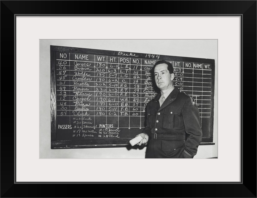 <p>Earl (Red) Blaik was football coach at the United States Military Academy from 1941 to 1958. The blackboard data lists the names, weights, heights, and playing positions of the opponent (Duke University) players. Oct. 27, 1944.</p>