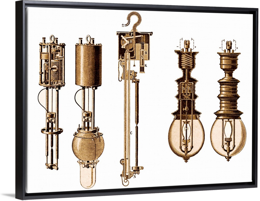 <p>Early electric lamps, historical artwork. Three types of electric lamp are shown here. From left to right: an internal and external view of a Cance lamp; an internal view of a Sautter-Harle lamp; and an internal and external view of a Jandus sealed-bulb lamp. The lamps are all named for their French inventors. They have electrical contacts at top, and are arc lamps, producing light from an electrical spark crossing a narrow gap between carbon electrodes (spark seen in the internal diagram for the Jandus lamp). Electric lighting began with Davy's electric carbon arc lamp in 1801, and numerous designs were developed during the 19th century. Artwork from A Travers l'Electricite (G. Dary, Paris, 1900).</p>