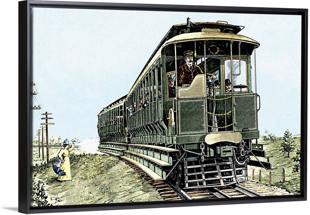 <p>Early electric train. Historical artwork of an early electric train used in Connecticut, USA. This train, running from New Haven to Hartford, is using a third rail, between the other two, to obtain power. This railroad is part of the New York-New Haven-Hartford Railroad, which from 1895 pioneered the electrification of railroads by using this third rail, instead of the overhead wires seen in tram systems. Artwork from A Travers l'Electricite (G. Dary, Paris, 1900).</p>