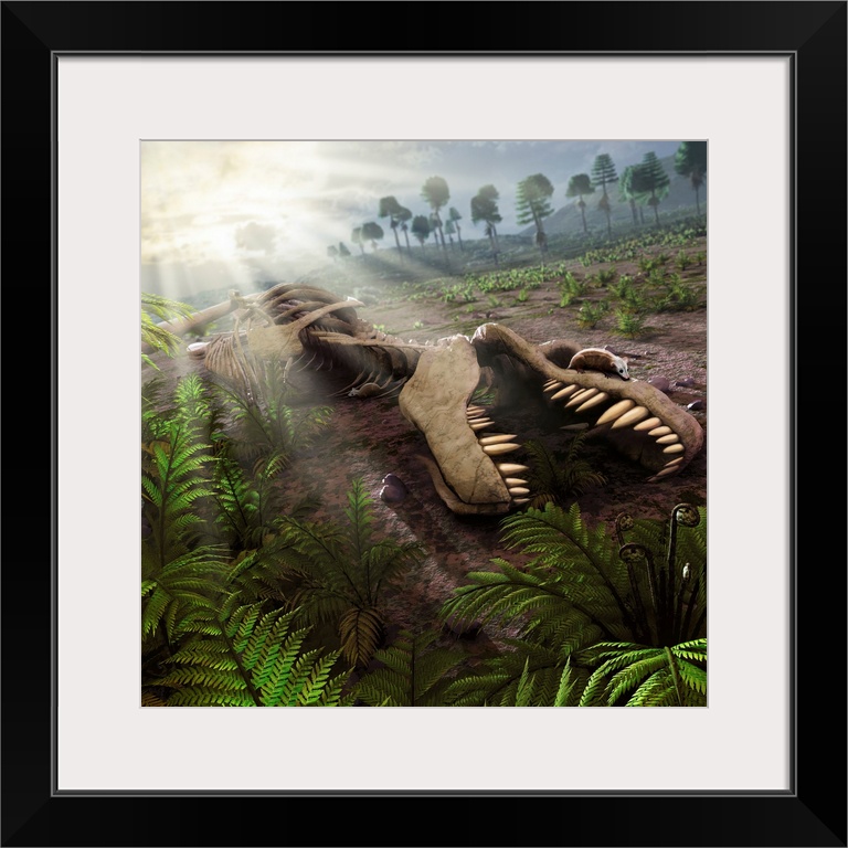 <p>Some 65 million years ago, a huge asteroid or comet, some 10 km across, wrought havoc when it plunged into the Earth and extinguished 65 of all life here, the dinosaurs and many marine and flying reptiles included. The impact would have plunged the Earth into a nuclear winter, perhaps for years, as debris from the impact was thrown into the atmosphere where it blocked out the Sun's life-giving rays. This illustration depicts a scene several years after the dinosaurs were wiped out. The atmosphere has started to clear, plants are coming back. and animal life is also making a recovery. A pair of ptilodus - a squirrel-sized mammal - are seen searching for food inside a carcass of a long-dead tyrannosaurus rex.</p>