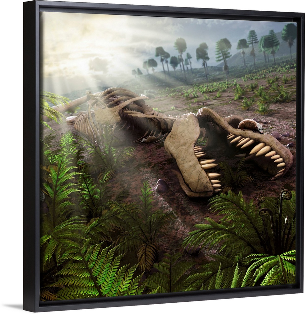 <p>Some 65 million years ago, a huge asteroid or comet, some 10 km across, wrought havoc when it plunged into the Earth and extinguished 65 of all life here, the dinosaurs and many marine and flying reptiles included. The impact would have plunged the Earth into a nuclear winter, perhaps for years, as debris from the impact was thrown into the atmosphere where it blocked out the Sun's life-giving rays. This illustration depicts a scene several years after the dinosaurs were wiped out. The atmosphere has started to clear, plants are coming back. and animal life is also making a recovery. A pair of ptilodus - a squirrel-sized mammal - are seen searching for food inside a carcass of a long-dead tyrannosaurus rex.</p>