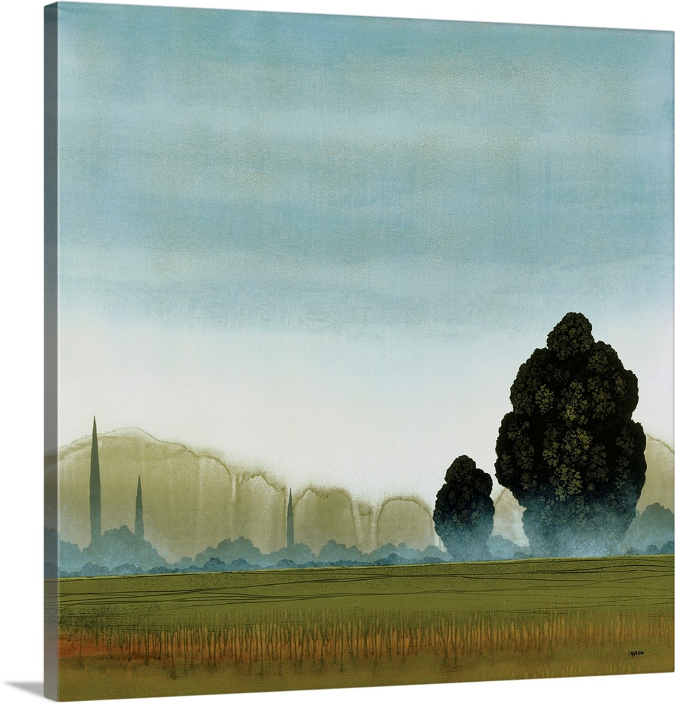 <p>A tranquil, misty landscape painting featuring a pale blue sky, distant green hills with spire-like forms, and a foreground field with dark, dense trees, rendered in soft, earthy tones.</p>