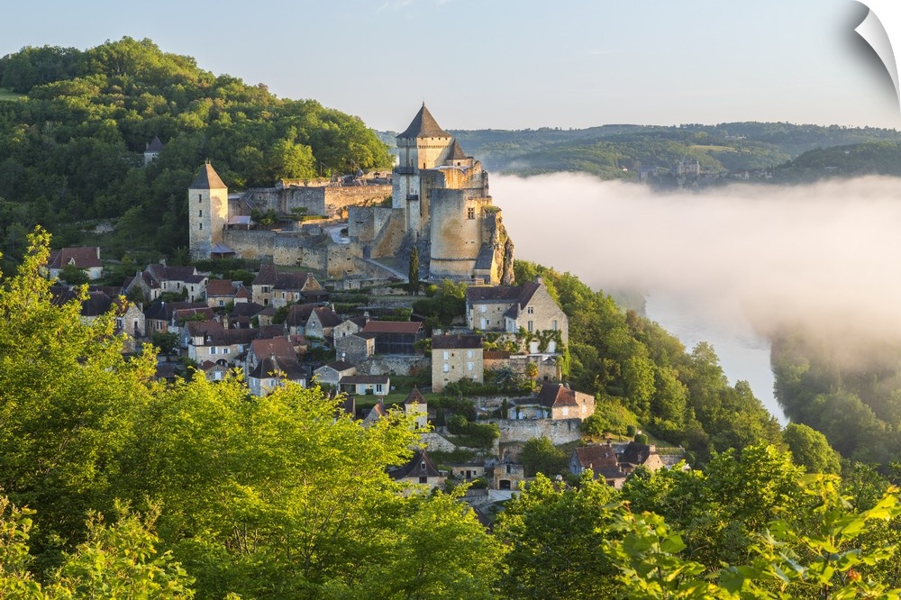 <p>Early morning mist, Chateau de Castelnaud, Castelnaud, Dordogne, Aquitaine, France.</p>