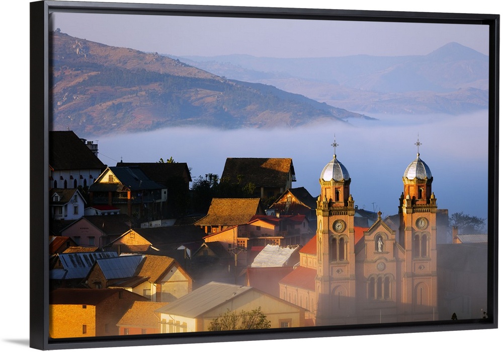 <p>Early morning mist on the Haute Ville old town, Ambozontany Cathedral, Fianarantsoa, central area, Madagascar, Africa</p>