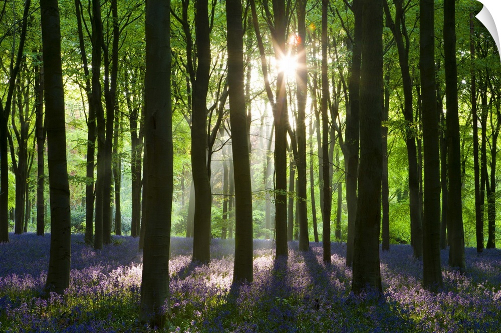 <p>Early morning sunlight in West Woods bluebell woodland, Lockeridge, Wiltshire, England. Spring</p>