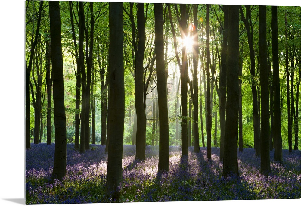 <p>Early morning sunlight in West Woods bluebell woodland, Lockeridge, Wiltshire, England. Spring</p>