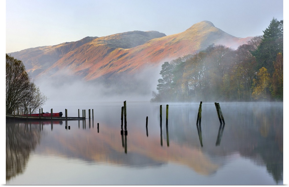 <p>Early morning tranquil scenes of Derwent Water, with Catbells rising out of the mist in the background, Lake District National Park, Cumbria, England, UK. Autumn (November) 2009</p>