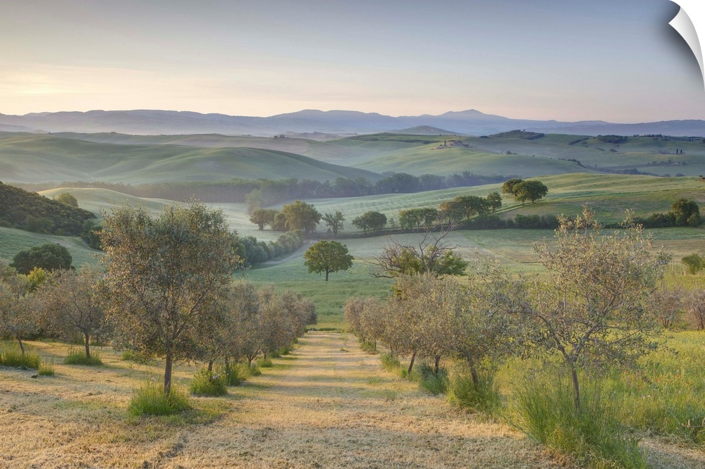 <p>Early morning view across Val d'Orcia from field of olive trees, San Quirico d'Orcia, near Pienza, Tuscany, Italy</p>