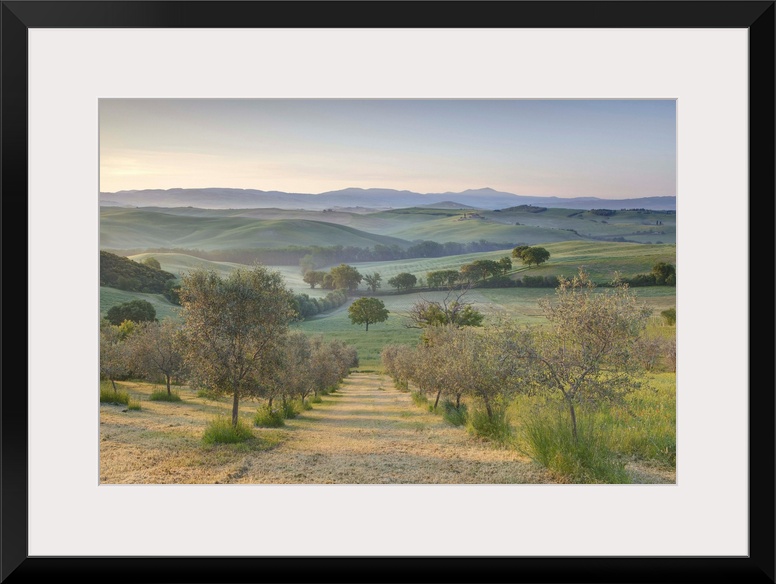 <p>Early morning view across Val d'Orcia from field of olive trees, San Quirico d'Orcia, near Pienza, Tuscany, Italy</p>