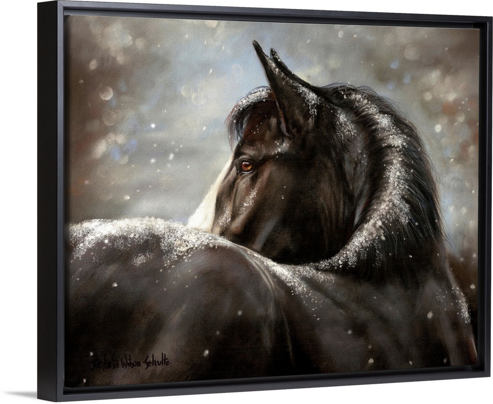 <p>Painting of a dark colored horse with light snow falling on it's mane and back.</p>