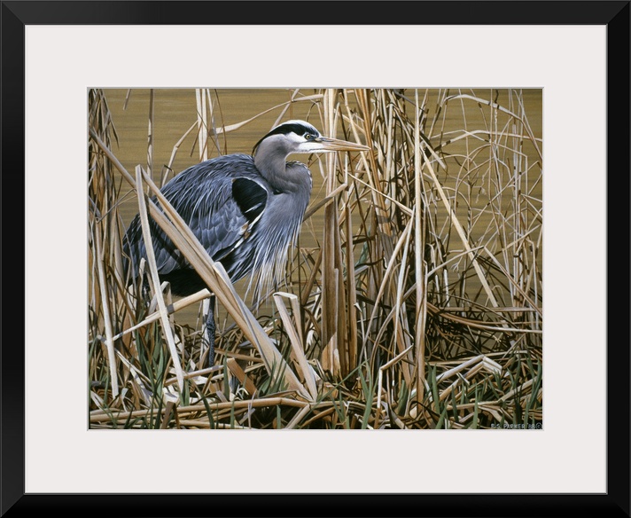 <p>A blue heron stands in a group of tall grass and reeds at the edge of a swamp.</p>