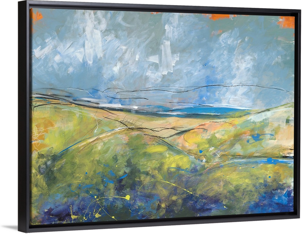 <p>A colorful contemporary abstract painting with contrasting black lines and playful yellow and blue paint splatter throughout. Made up of blues, purple, orange, green, yellow and white.</p>