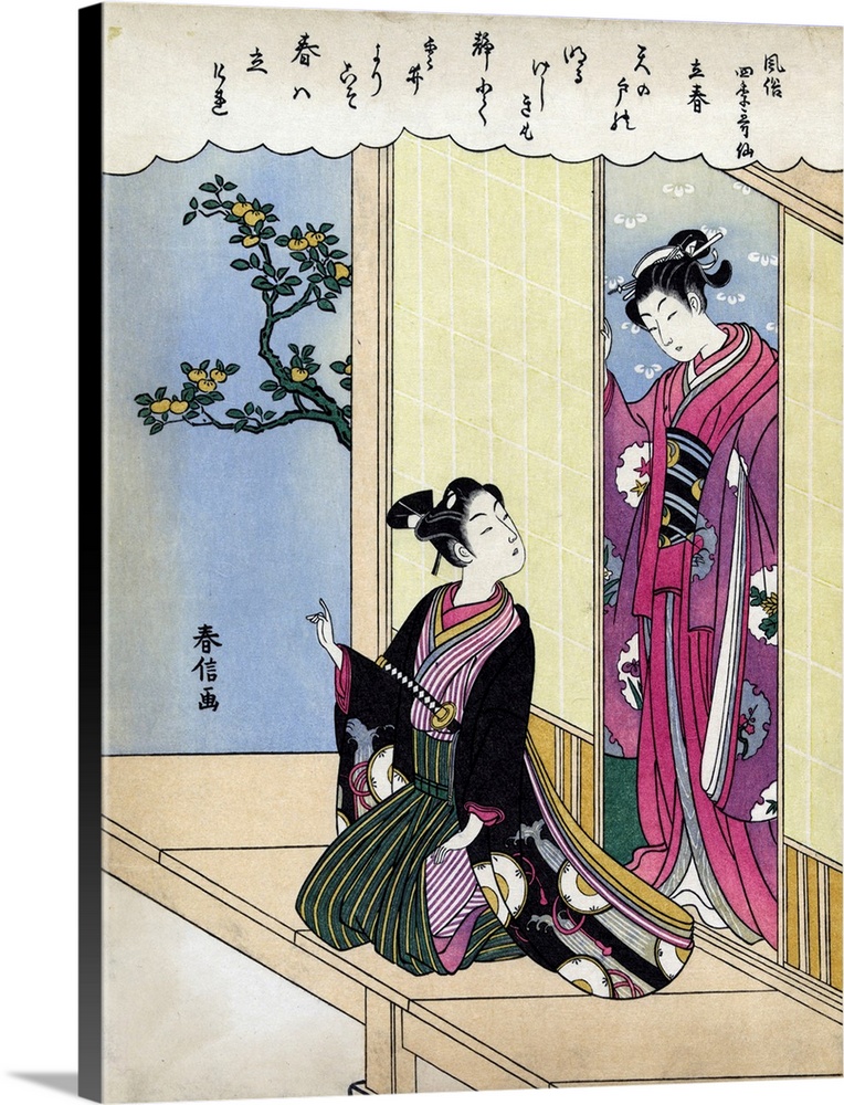 <p>Early Spring' by Harunobu Suzuki (1725-1770). Woodcut colour. Print of a man sitting on a veranda, turned to look at a woman standing in a doorway.</p>