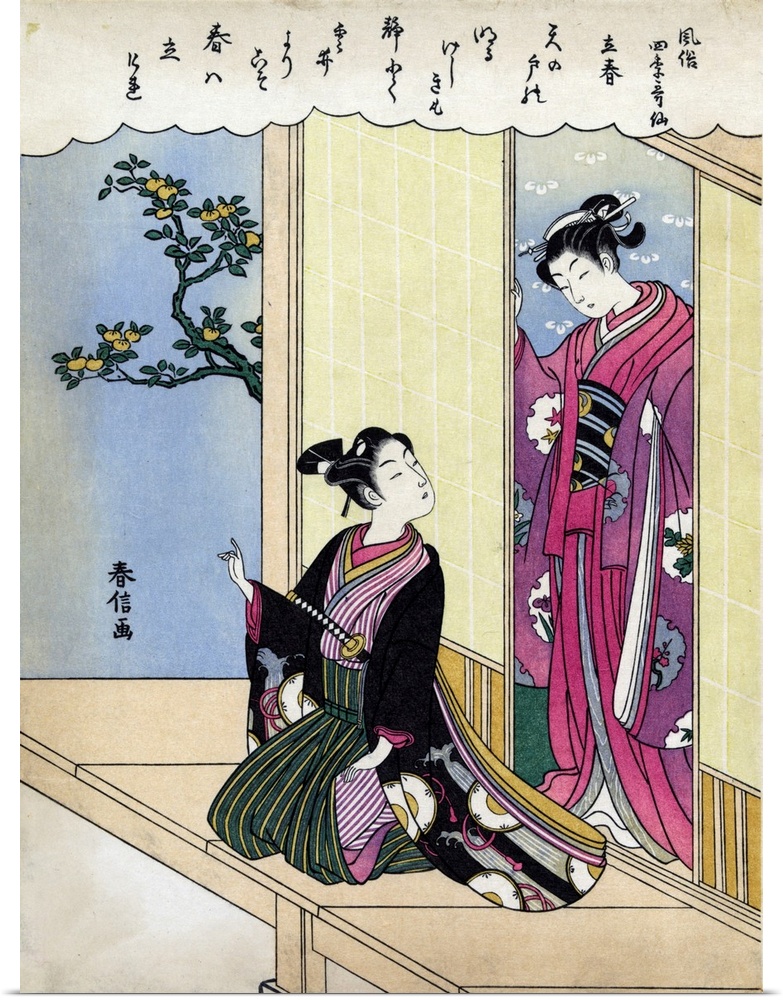 <p>Early Spring' by Harunobu Suzuki (1725-1770). Woodcut colour. Print of a man sitting on a veranda, turned to look at a woman standing in a doorway.</p>