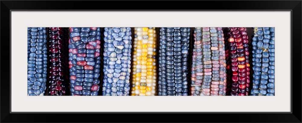 <p>Ears of Native American corn (Zea mays) including Hopi Blue, Vadito Blue, Escondido Blue, Painted Mountain and other varieties, grown on the small farm of Russell Gordon and Jelena Kajtaz in the hills of central Serbia.</p>