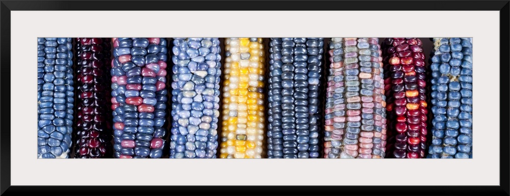 <p>Ears of Native American corn (Zea mays) including Hopi Blue, Vadito Blue, Escondido Blue, Painted Mountain and other varieties, grown on the small farm of Russell Gordon and Jelena Kajtaz in the hills of central Serbia.</p>