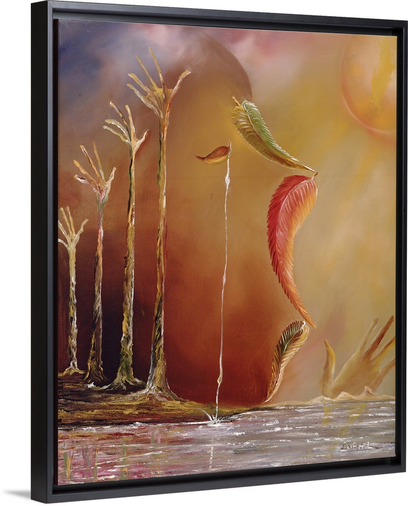 <p>Contemporary oil painting of water in the shape of four hands reaching upward. Leaves falling down create the outline of a face and a small floating leaf with water trickling down symbolizes an eye with tears.</p>