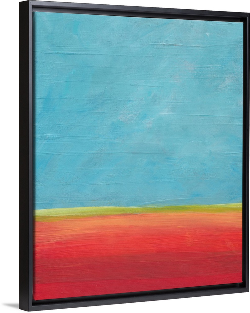 <p>A blue sky and a calm horizon come together in this landscape painting. Red earth and open space.</p>