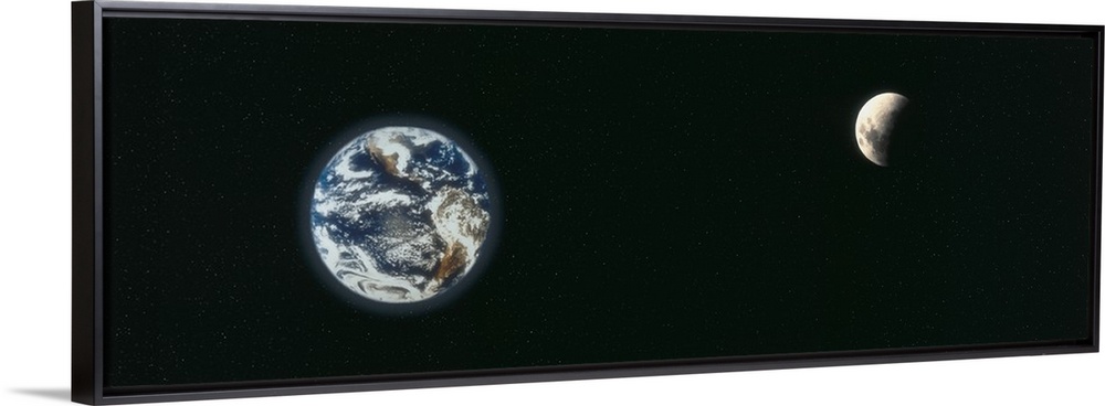 <p>A panoramic re-creation of the earth and a half shaded moon from outer space.</p>