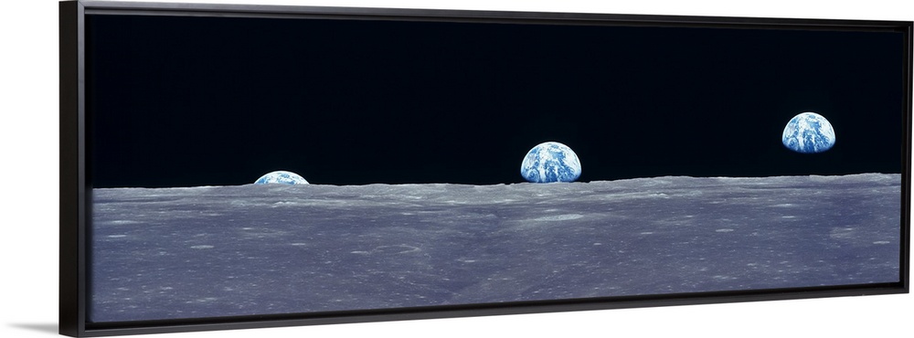 <p>Composite image from the surface of the moon of three photos of the planet Earth rising over the horizon.</p>