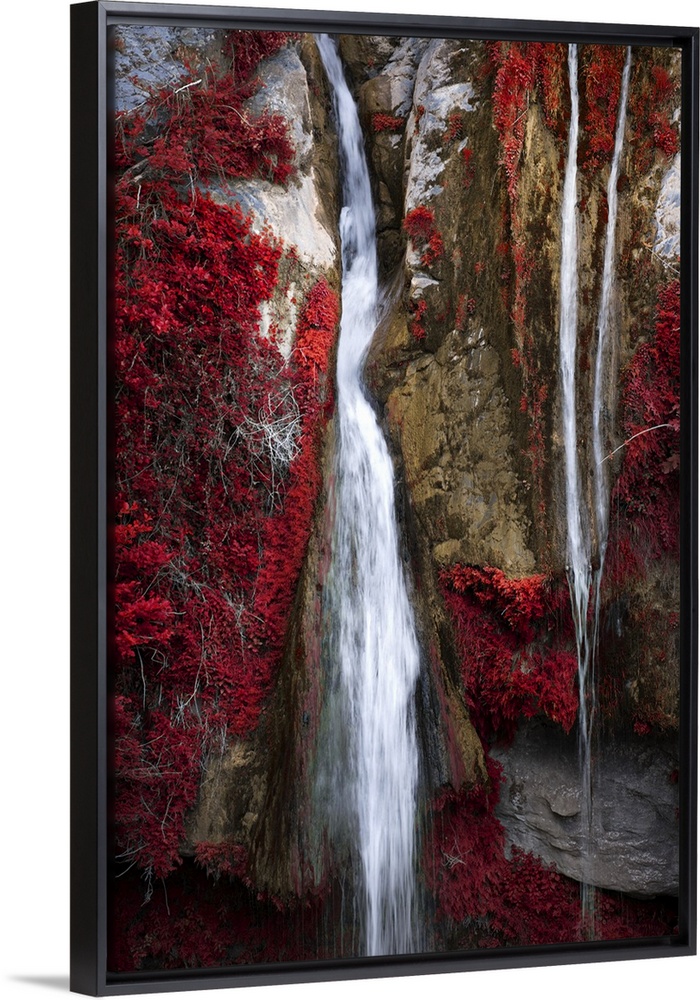 <p>A photograph of a thin waterfall running through cracked rocks and fall foliage.</p>