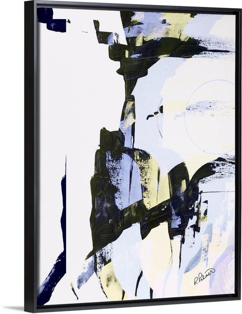 <p>Abstract painting with sporadic brushstrokes in black, yellow, and light purple hues on a white background.</p>