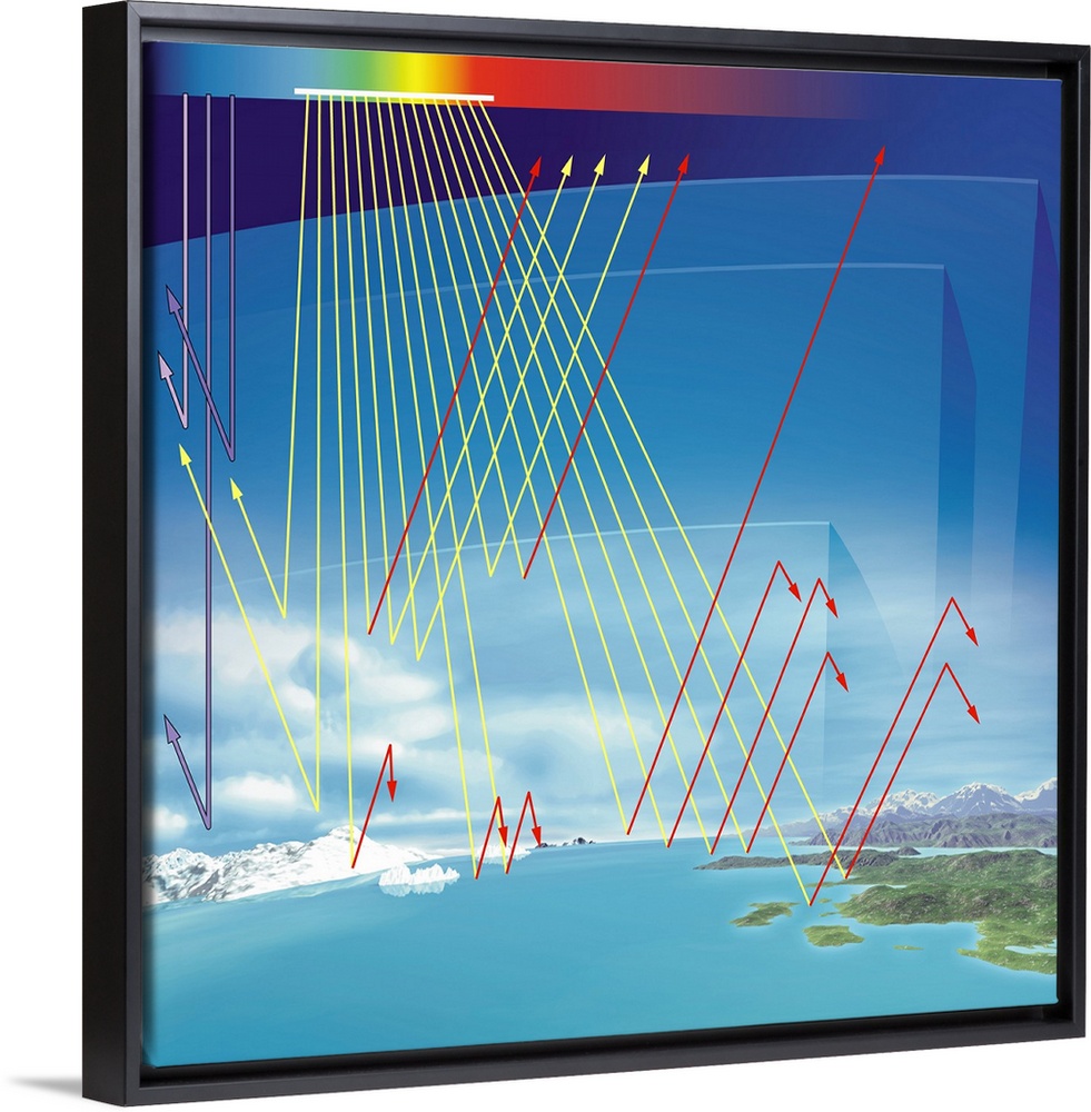 <p>Earth's atmosphere and solar radiation. Computer artwork of the effect of the Earth's atmosphere on solar radiation. Shown here are the three lowest levels (blue rectangles) of the Earth's atmosphere, the troposphere (bottom), stratosphere (middle) and mesophere (top).The electromagnetic spectrum is across top. Ultraviolet (UV) light (purple lines) that enters the atmosphere is mostly absorbed by ozone in the stratosphere, although some of it does reach the surface. Some of the visible light (yellow lines) is scattered by gases and suspended particles in the troposphere. Visible light that hits the surface may be re-radiated at a longer (infrared) wavelength (red lines).</p>