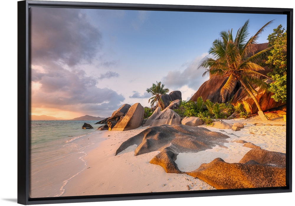 <p>East Africa, Indian Ocean, Seychelles, La Digue Island, Anse Source d'Argent, Palm beach with typical granite rock formations. La Digue, Seychelles, Anse Source d'Argent, Seychelles.</p>