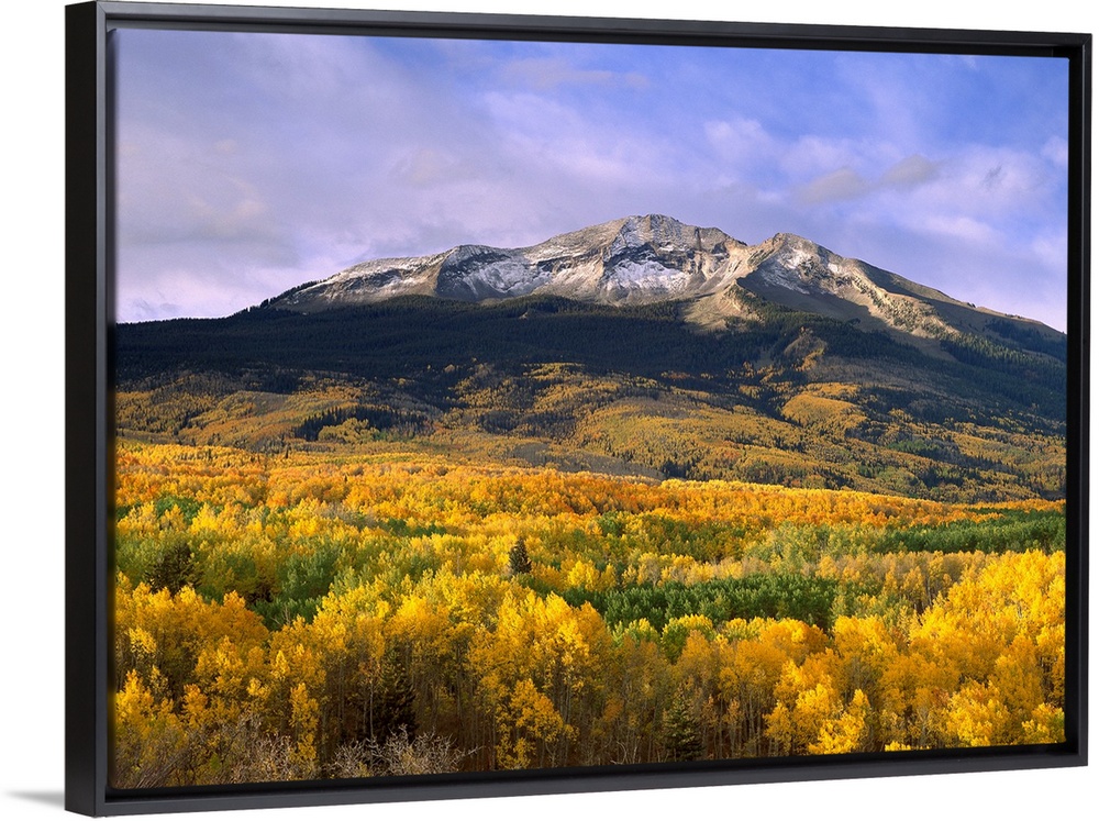 <p>Beautiful nature photograph of East Beckwith Mountain towering above orange and yellow fall trees in the Gunnison nation Forest.</p>