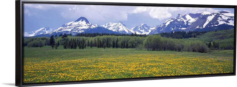 <p>Panoramic view of a snow covered mountain range with a thick forest in front and a flower covered field.</p>