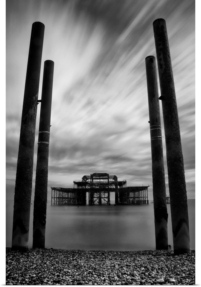 <p>Burnt out remains of the east pier in Brighton in East Sussex, England with long exposure</p>