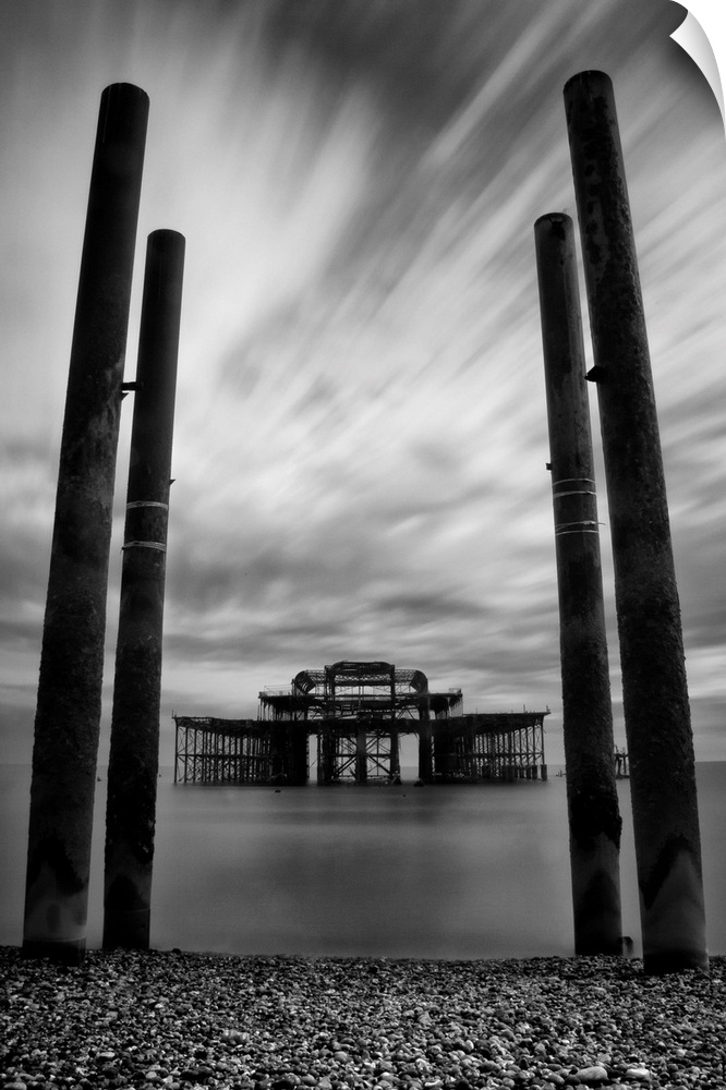 <p>Burnt out remains of the east pier in Brighton in East Sussex, England with long exposure</p>