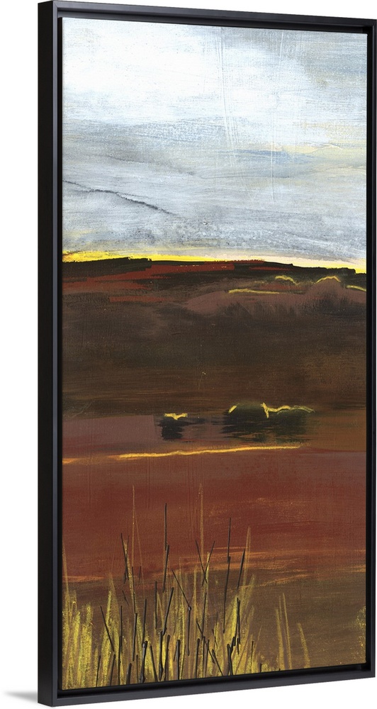 <p>A long vertical painting of an abstract landscape of a prairie field in textured earth tones.</p>