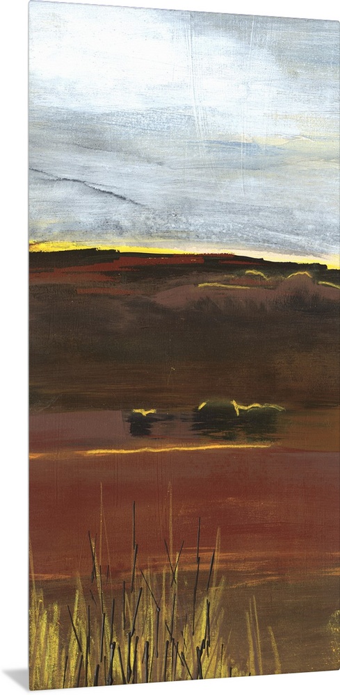 <p>A long vertical painting of an abstract landscape of a prairie field in textured earth tones.</p>